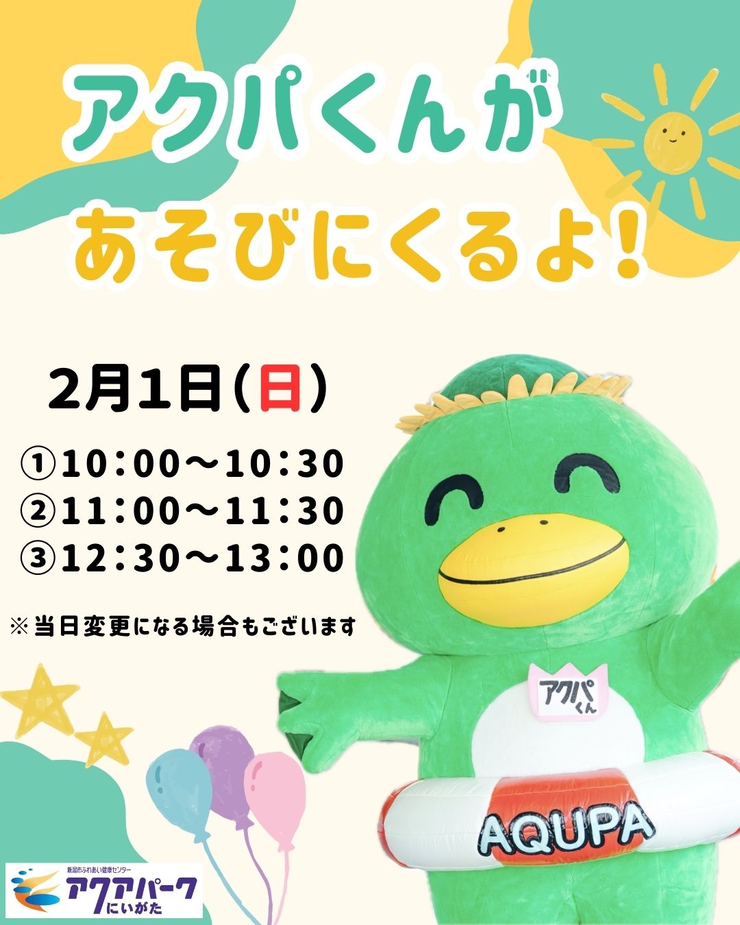 | 実施内容 | アクパくんが遊びに来てくれます♪ 一緒に写真を撮ったり握手したりしよう! ※スケジュールは当日変更になる場合もございますので、予めご了承ください。 |